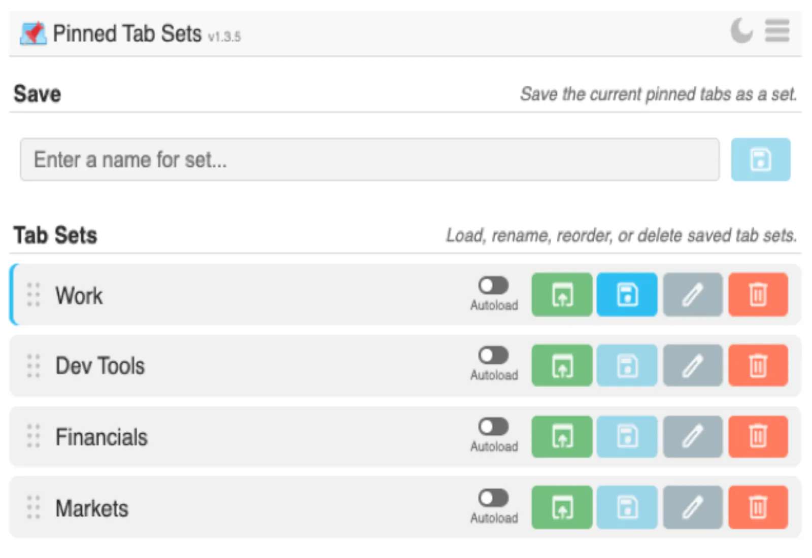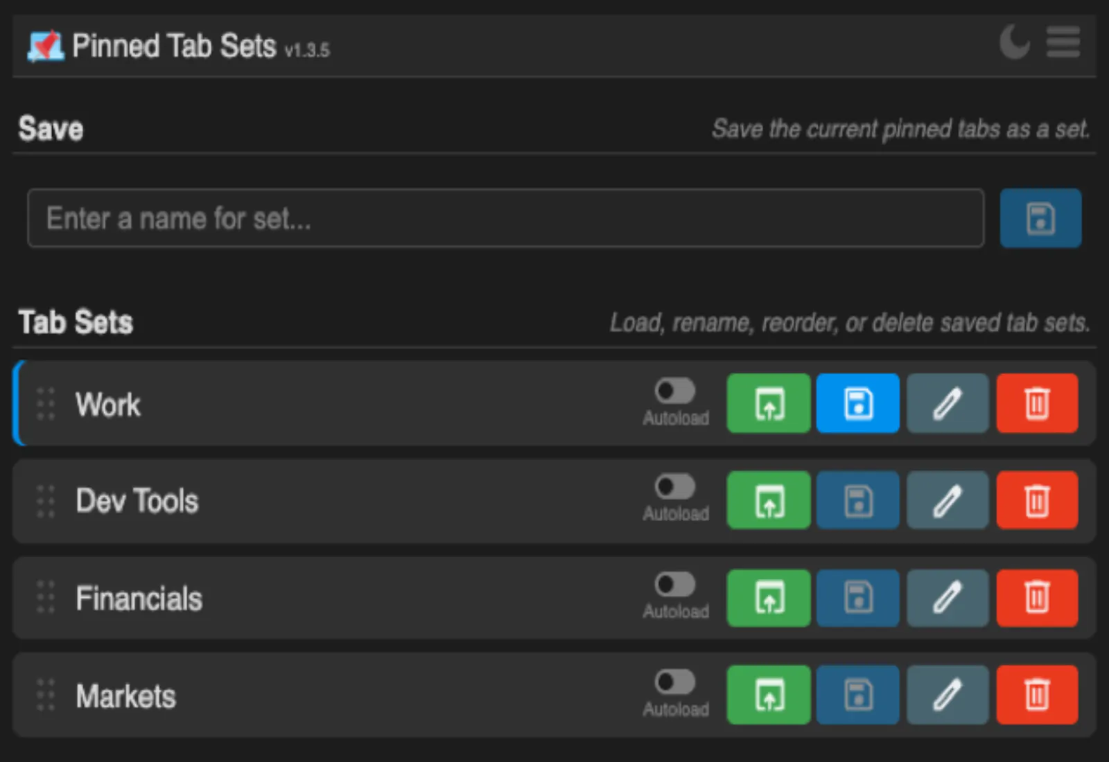 Capture your current pinned tabs as named sets (e.g., Work, Personal, Research) and switch between them in a click.